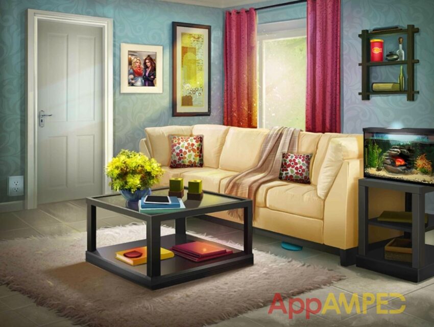 Inside the living room, there’s a puzzle piece under the couch. Another puzzle piece is on the table. Take the fish food from the shelf and feed the fish to get the key behind them. Use it to open the door to the bedroom.