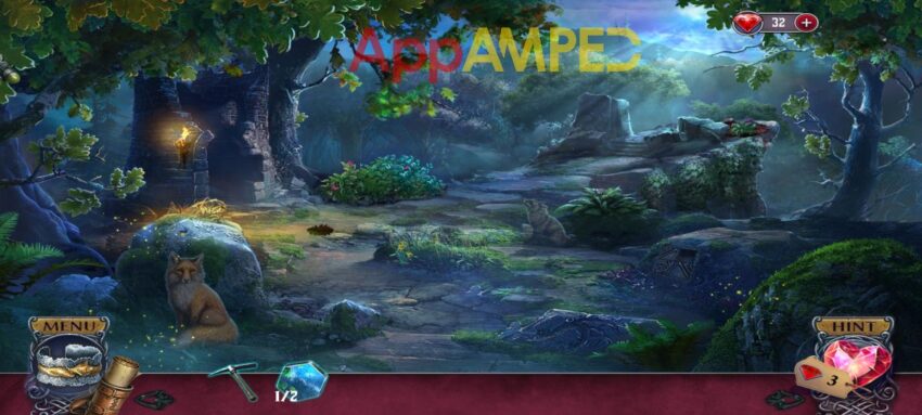 Use the token on the ground to your right and fix the heart puzzle, then take the crystal (1/3). Go to the hidden gold, use the berries to convince the squirrel to give you the other fragment (2/2). Go to the tree and put both fragments here.